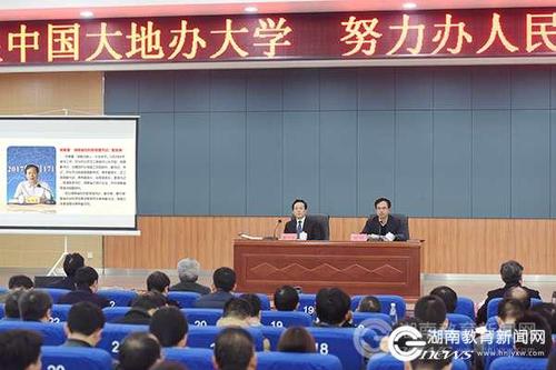 本网讯(通讯员 熊玲芝 摄影 何帅文)12月6日下午,湖南省社科联党组书记、副主席宋智富以“深入学习贯彻党的十九大精神 奋力建设富饶美丽幸福新湖南”为主题,来必赢76net线路官网宣讲十九大精神。宣讲会由党委书记陈弘主持。党委副书记、校长曾宝成及在校领导宋宏福、彭立威、郑山明、李常健、吴小林、程智开,永州市社科联主席陈水恩等参加了这次宣讲会。